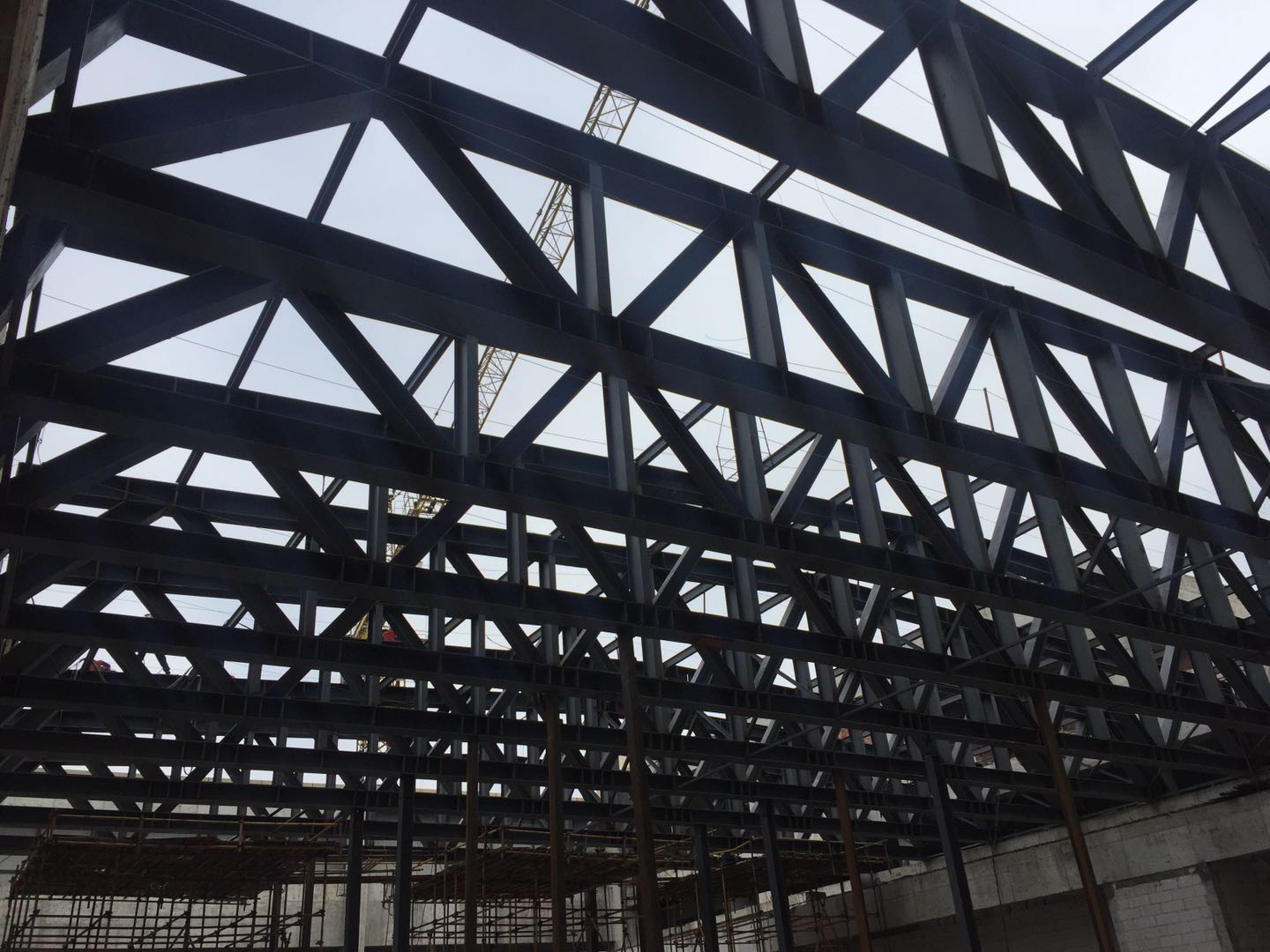 項(xiàng)目總占地面積19.98畝,其主體擬建一座五星級(jí)賓館,總建筑面積約61150平方米(其中地上40235平方米,地下20915平方米)。地下2層,主樓地上24層,建筑高度98m,裙房地上5層,建筑高度32m。裙樓鋼結(jié)構(gòu)屋蓋為空間桁架結(jié)構(gòu),包含16榀平面桁架及桁架間垂直及水平支撐。桁架最高點(diǎn)處標(biāo)高32.138m,長度31m,高度2.2m~2.96m之間,桁架下弦支承于標(biāo)高28.772m的混凝土梁上。