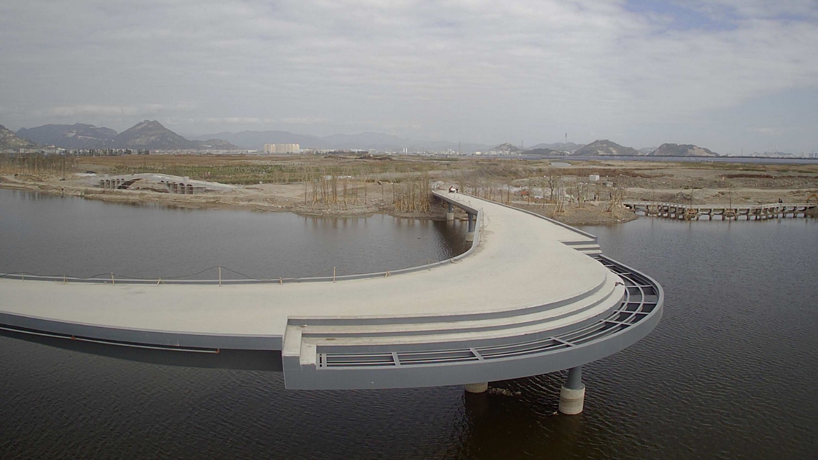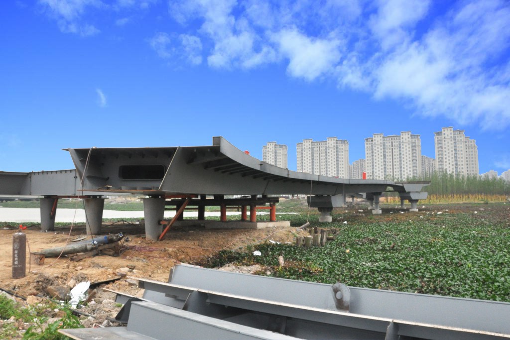 樂(lè)清灣3號(hào)/4號(hào)橋橋?yàn)楫愋芜B續(xù)鋼箱梁結(jié)構(gòu)。第一聯(lián)和第二聯(lián)跨徑布置為(4×30)+(2×21)米,第三聯(lián)為Y型結(jié)構(gòu),左右分支布跨分別為(25.828+2×25)米和(25.761+2×20)。橋梁標(biāo)準(zhǔn)全寬5.0米。上部結(jié)構(gòu)均采用閉口截面焊接鋼箱梁結(jié)構(gòu),第一聯(lián)和第二聯(lián)均采用等寬等高單箱單室截面;第三聯(lián)第一跨采用變寬等高單箱雙室截面,其他跨均采用等寬等高單箱單室截面(具體布置詳見(jiàn)相關(guān)圖紙)。箱梁高度均為1.1米,底板寬度為2.10米,頂板寬度為5.0米,采用斜腹板。箱梁頂板、底板厚度均為16mm,腹板厚度為14mm,箱梁頂板、底板和腹板均設(shè)有縱向加勁肋。箱梁橫向基本每隔2.0米設(shè)置一道橫隔板,橫隔板均按沿橋梁軸線(xiàn)徑向布置,橫隔板厚度為12mm;梁端及橋墩支座位置處均設(shè)置橫隔梁,橫隔梁厚度為20mm和25mm。